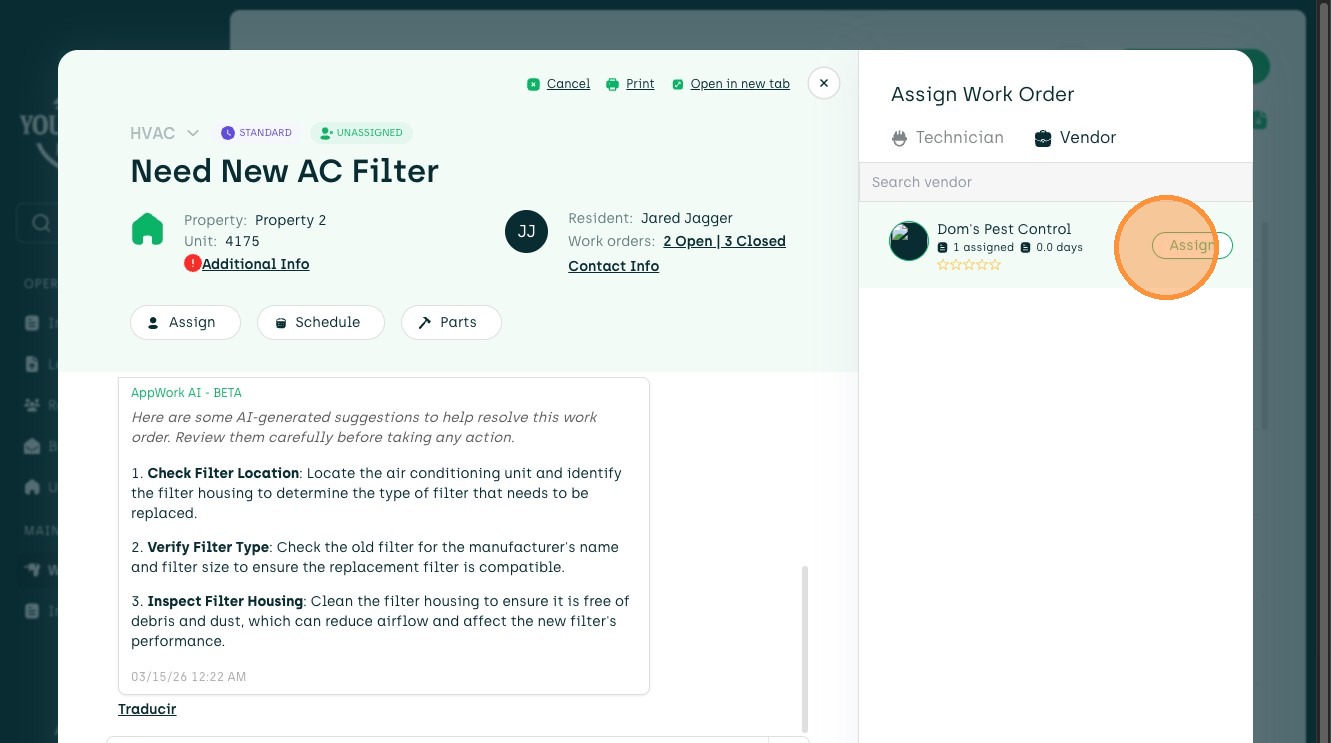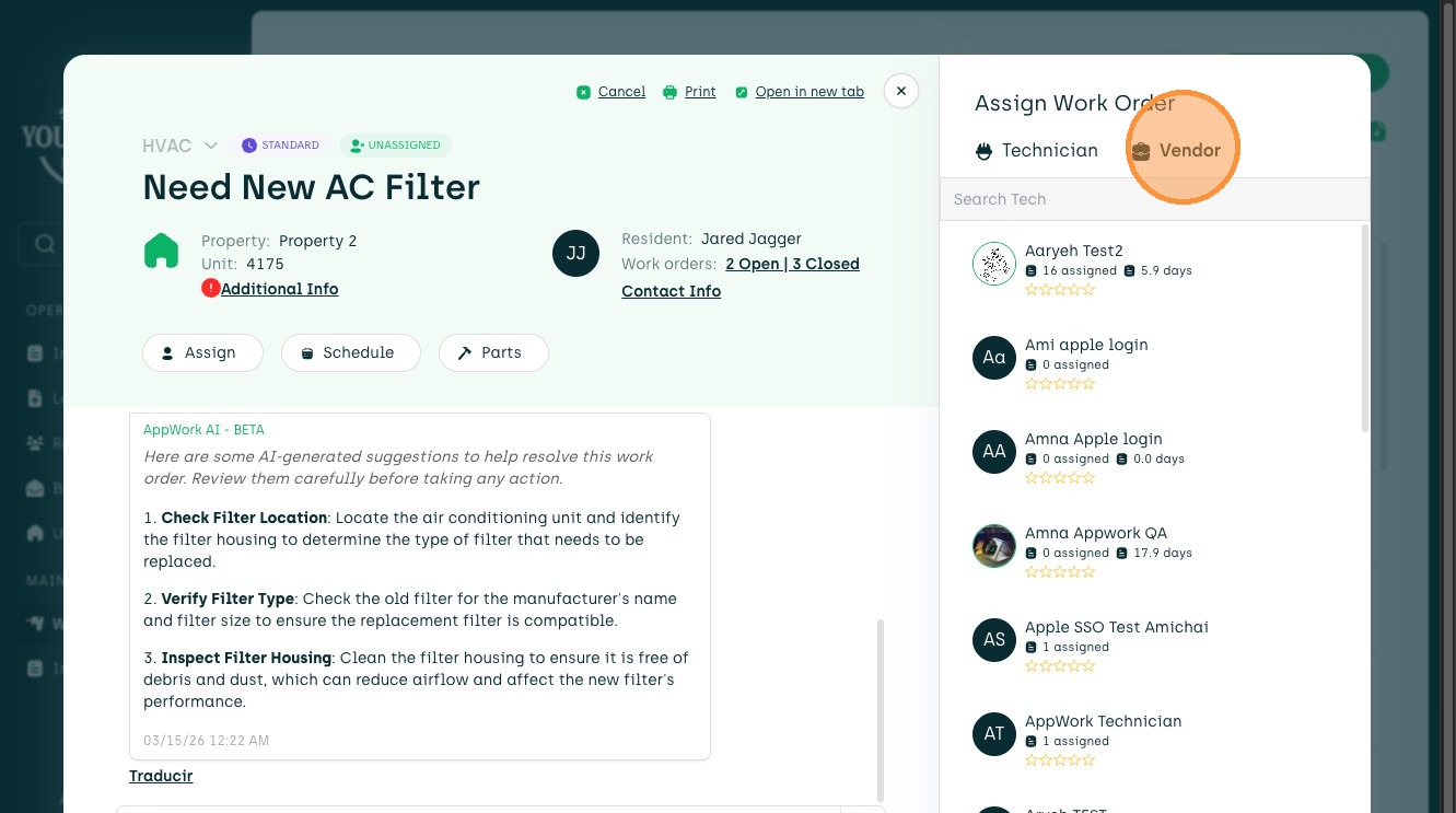 15. Choose Technician or Vendor to Assign