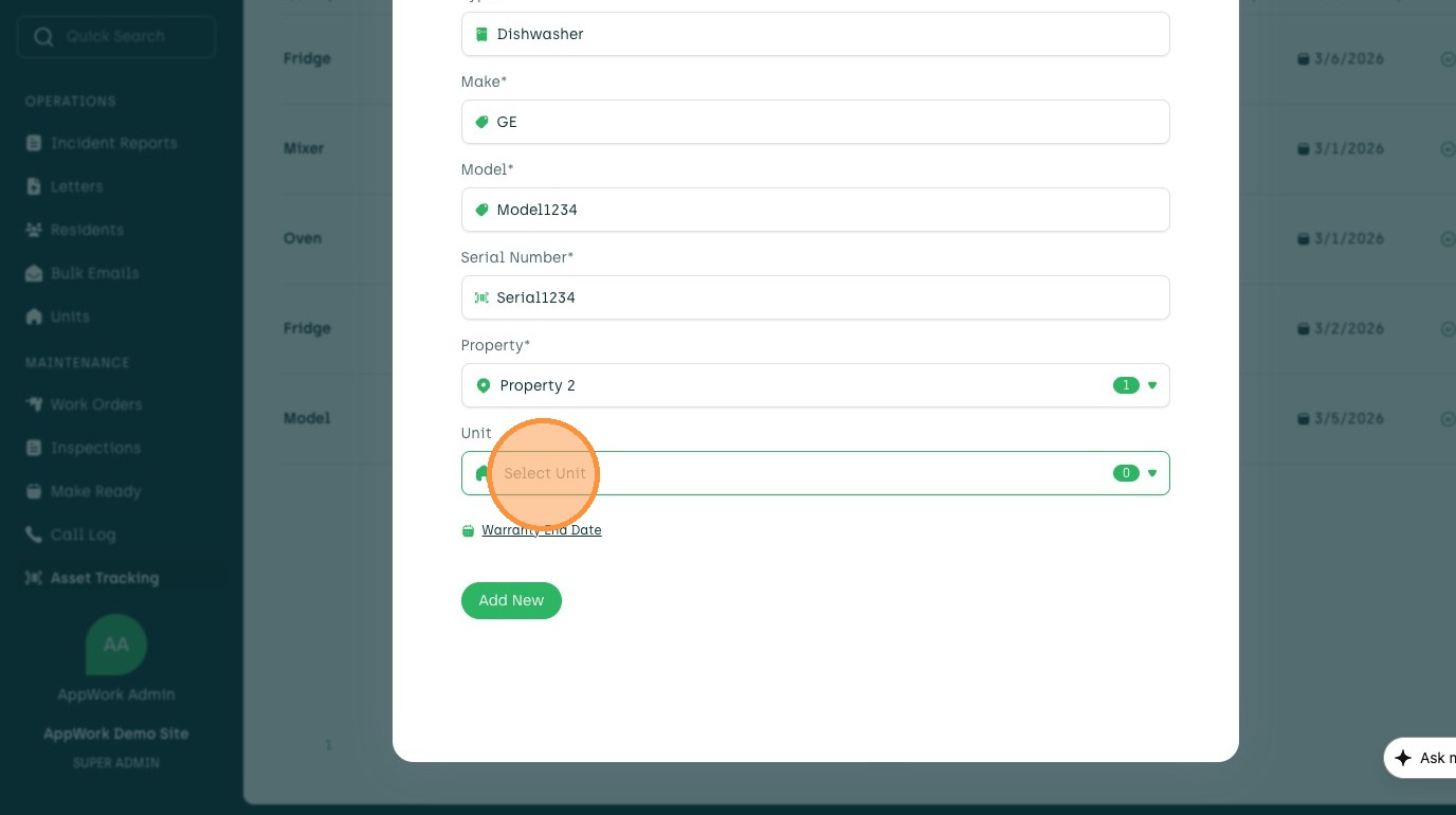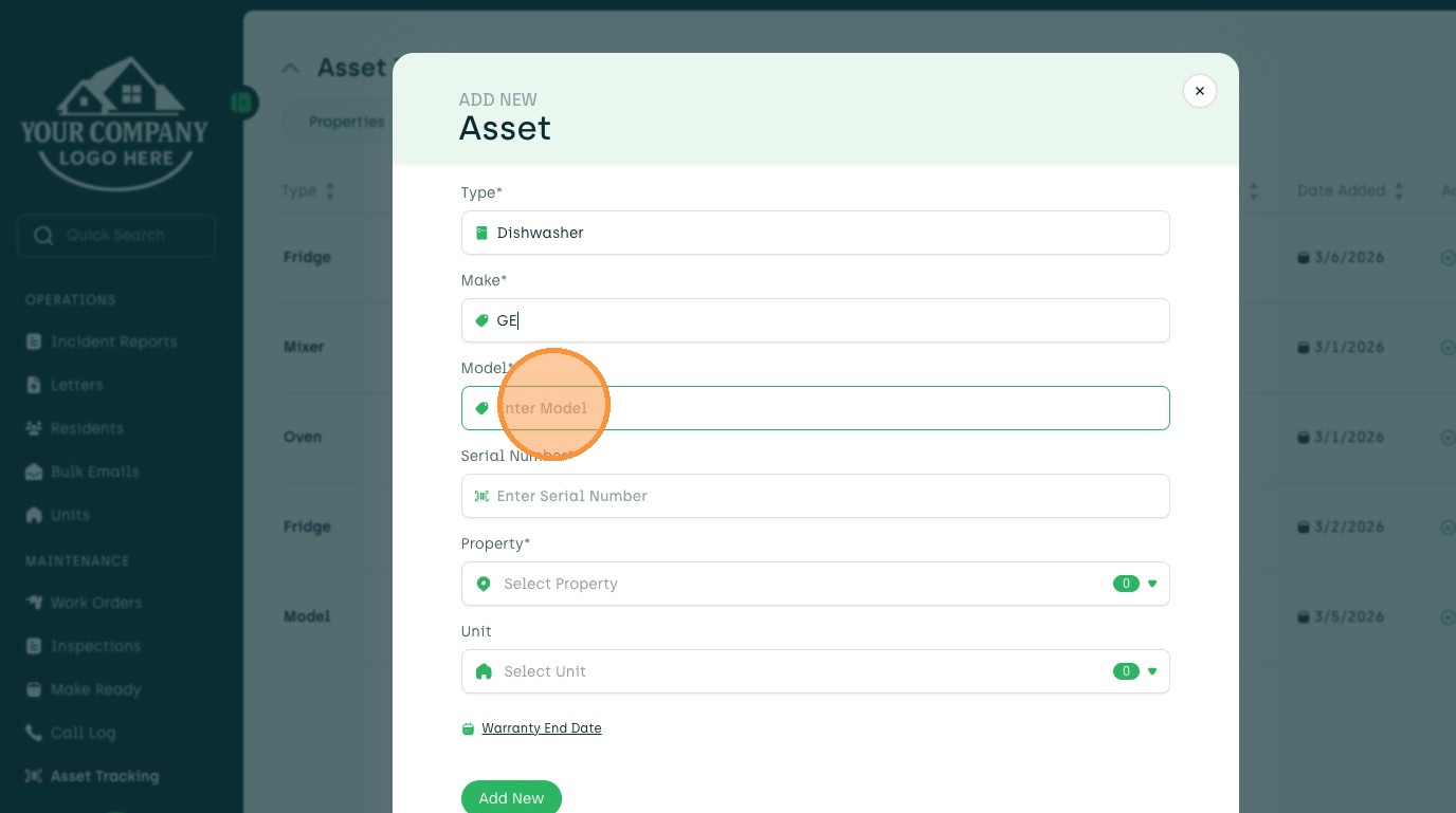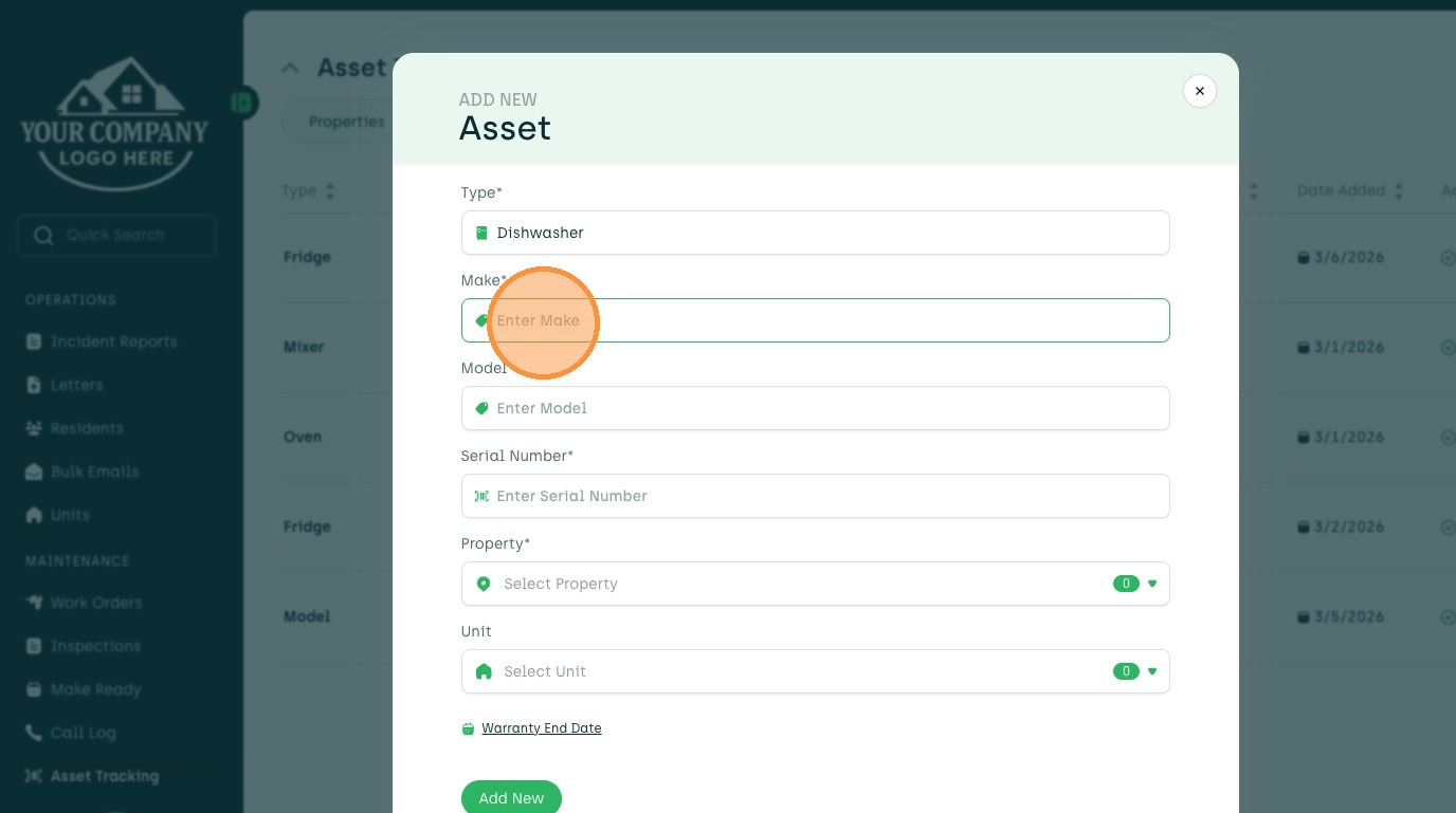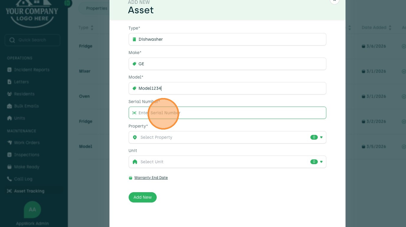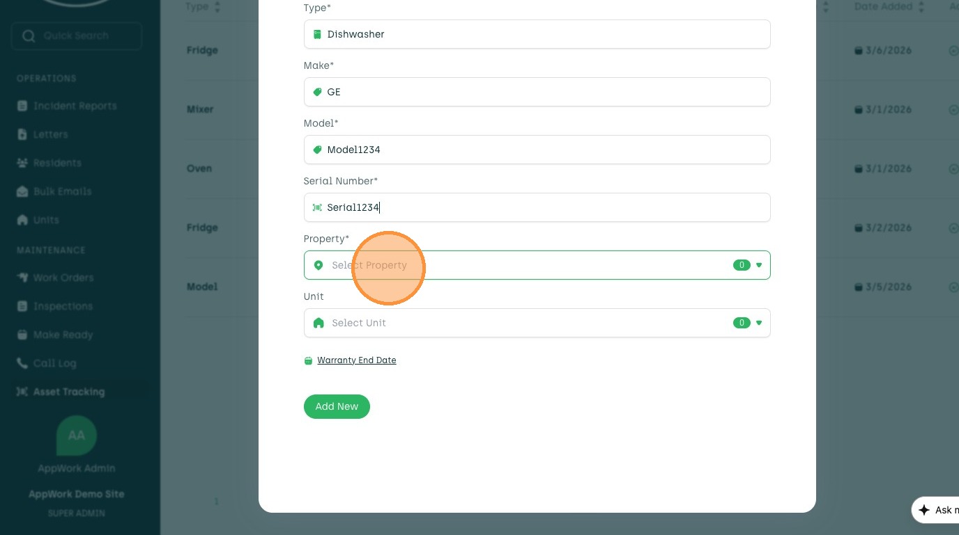 Learn how to add a new asset, such as a dishwasher, to your account. This guide walks you through entering asset details, selecting a property and unit, and setting the warranty end date.