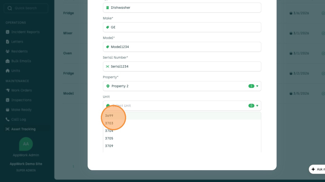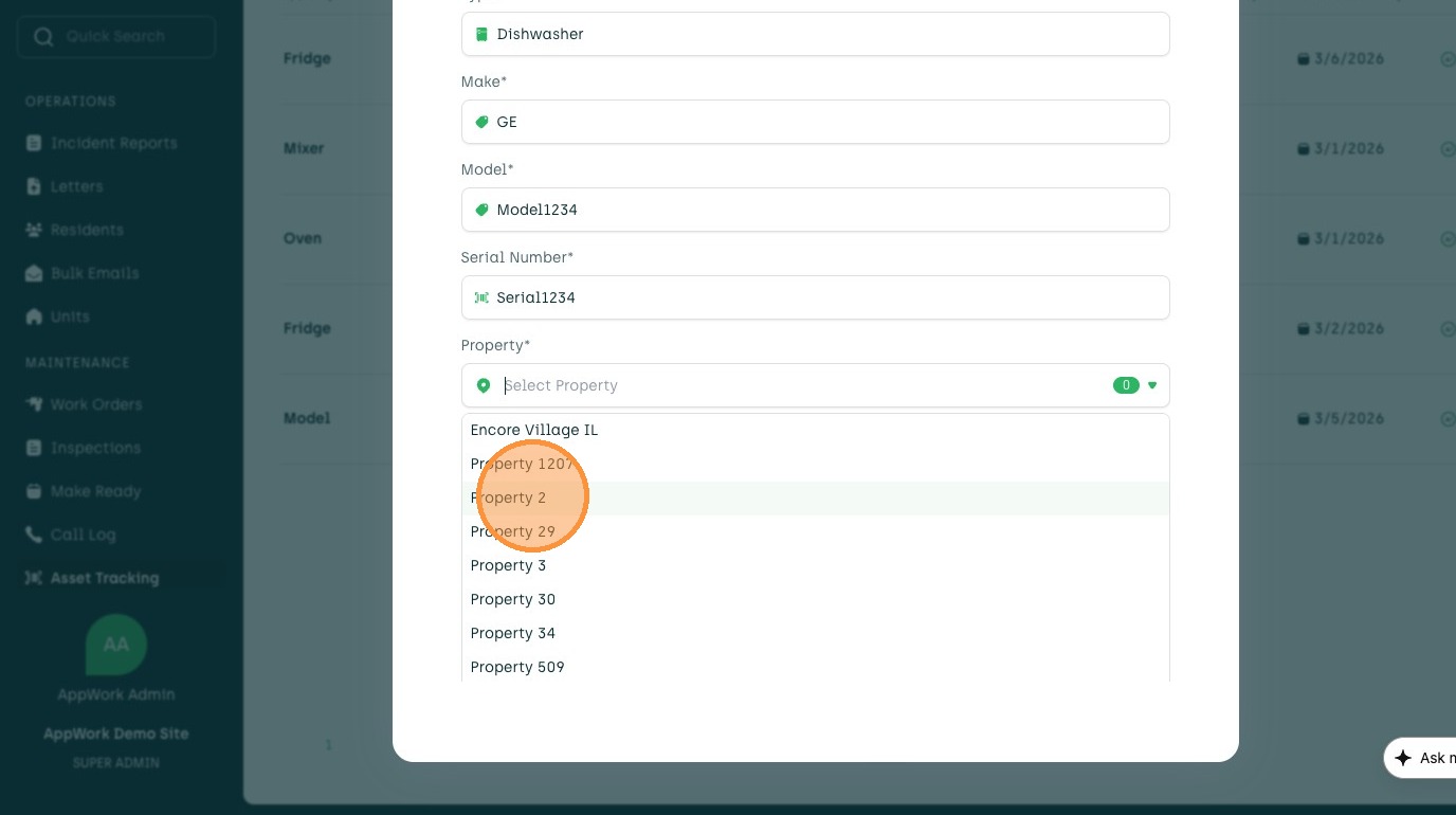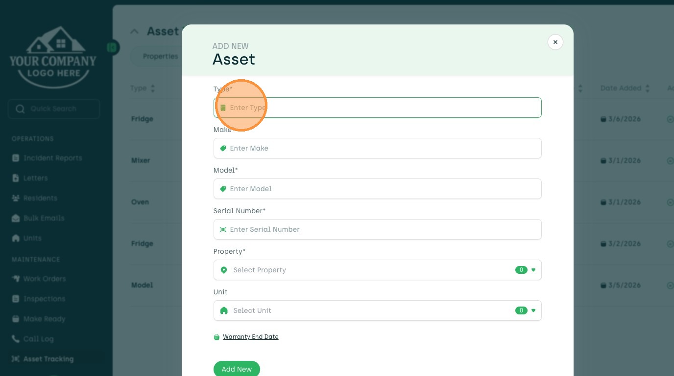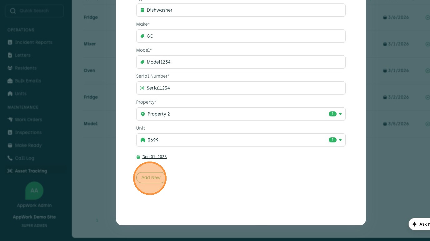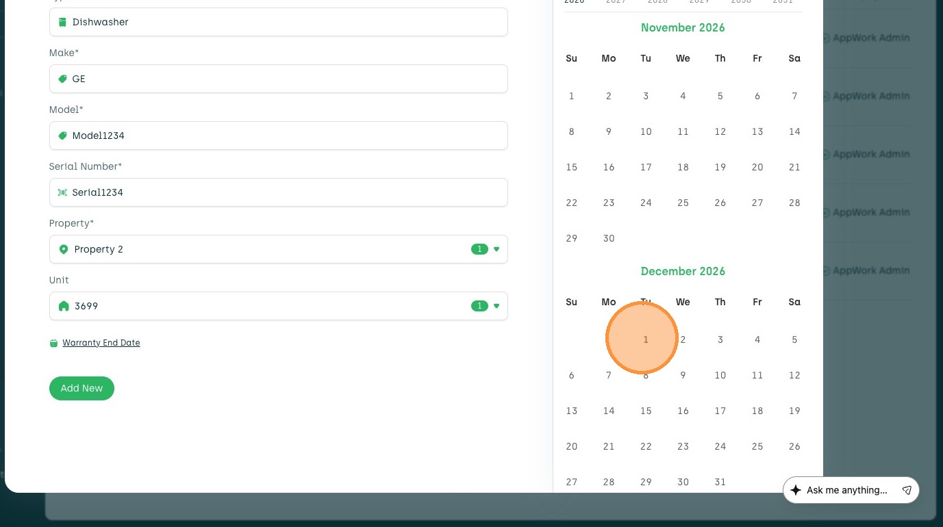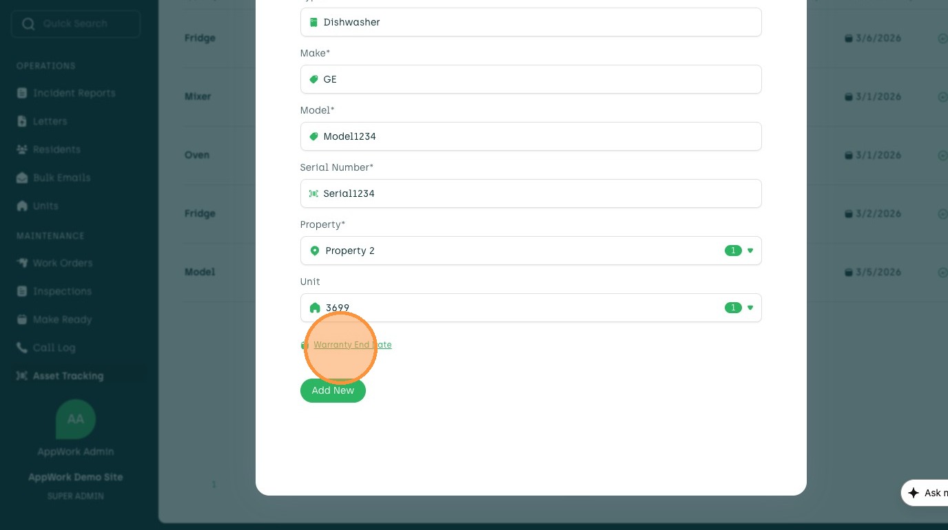 Learn how to add a new asset, such as a dishwasher, to your account. This guide walks you through entering asset details, selecting a property and unit, and setting the warranty end date.