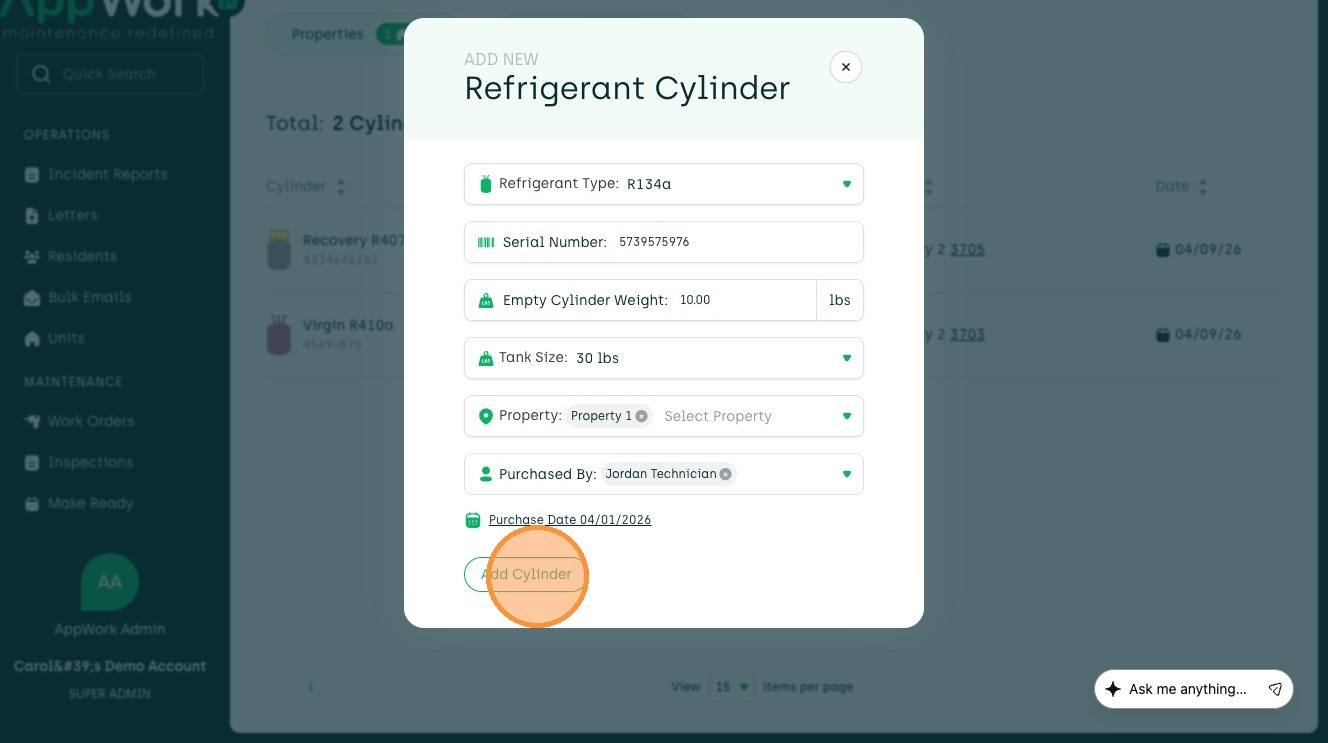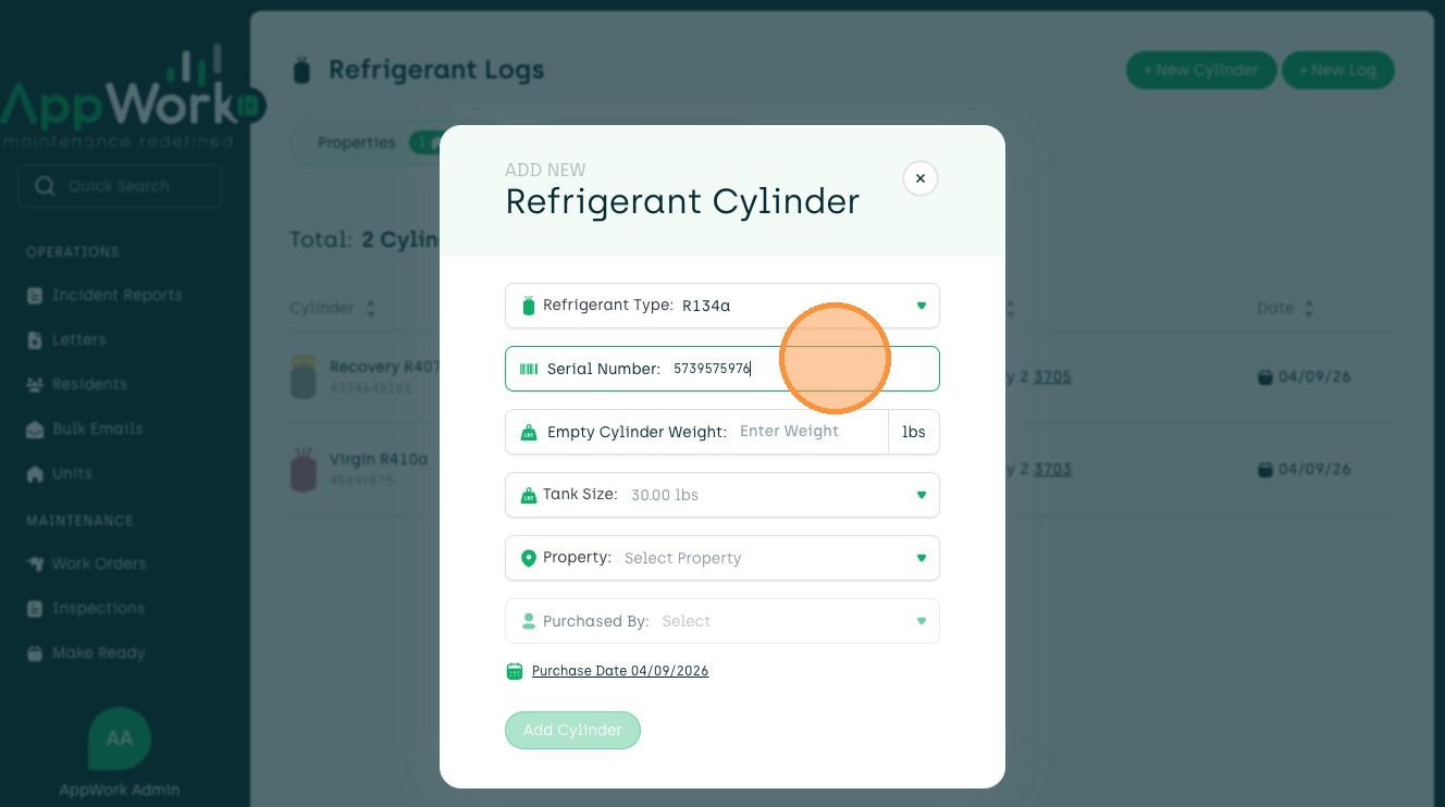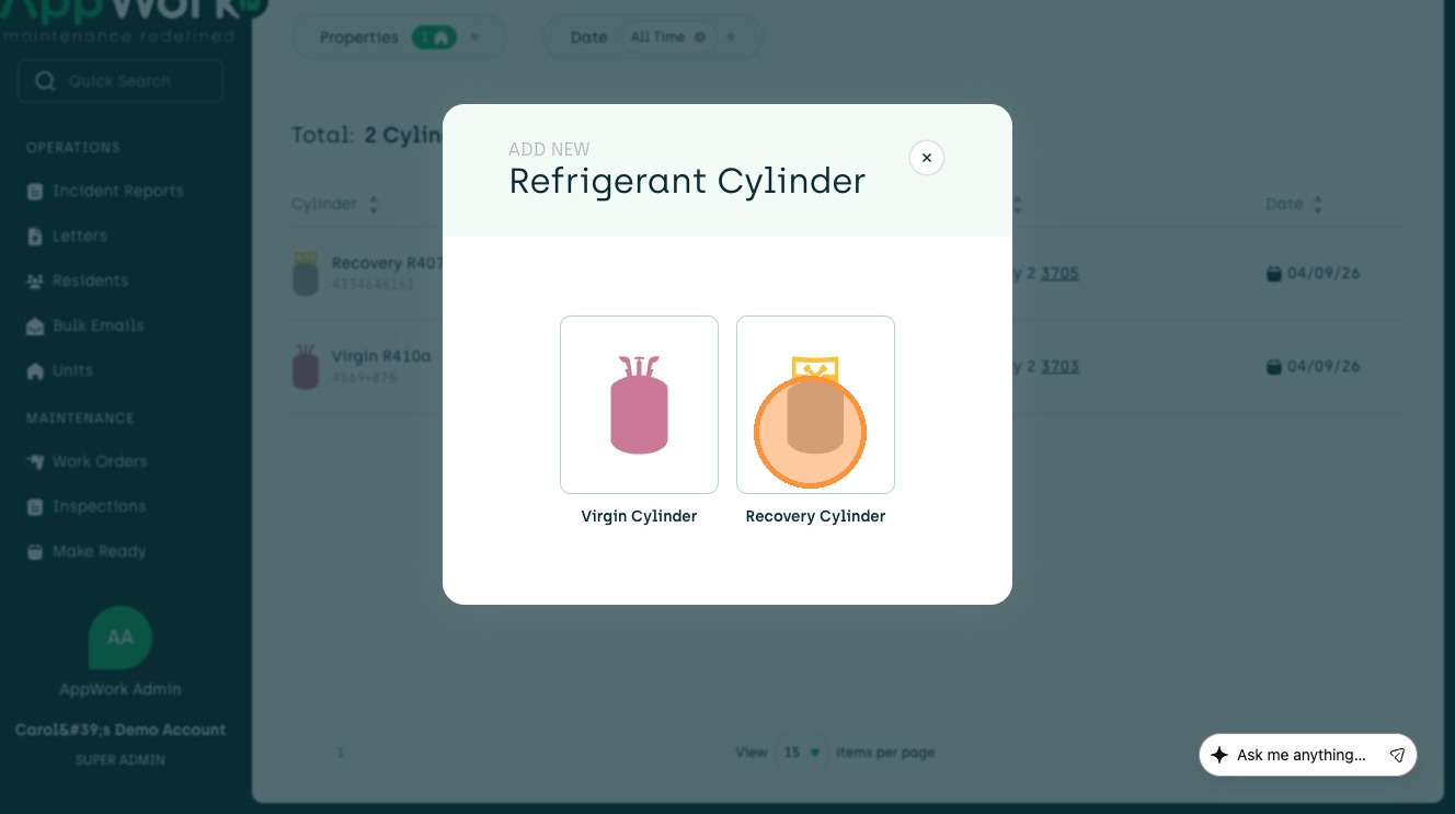 How to Add A Recovery Refrigerant Cylinder In AppWork