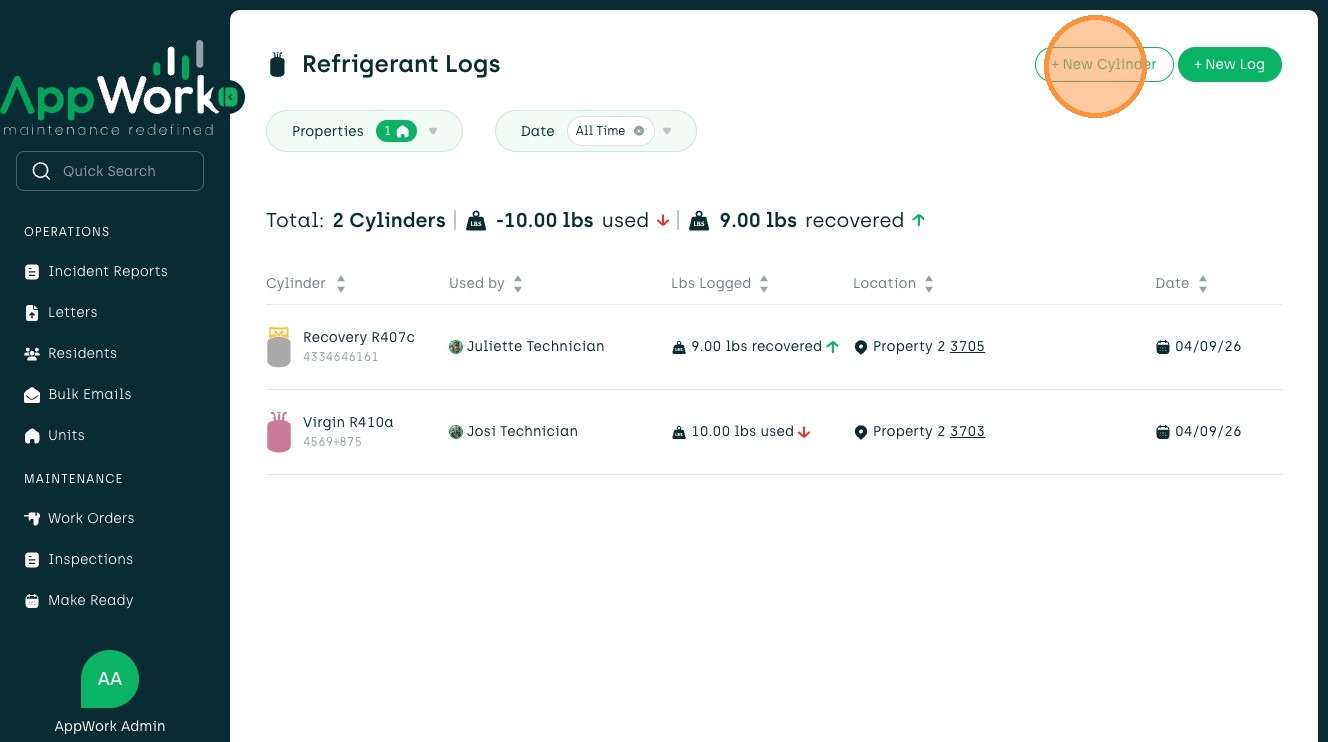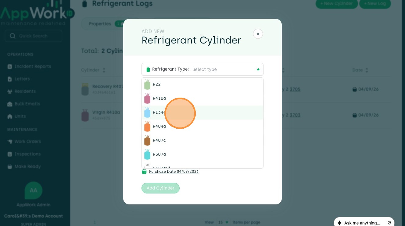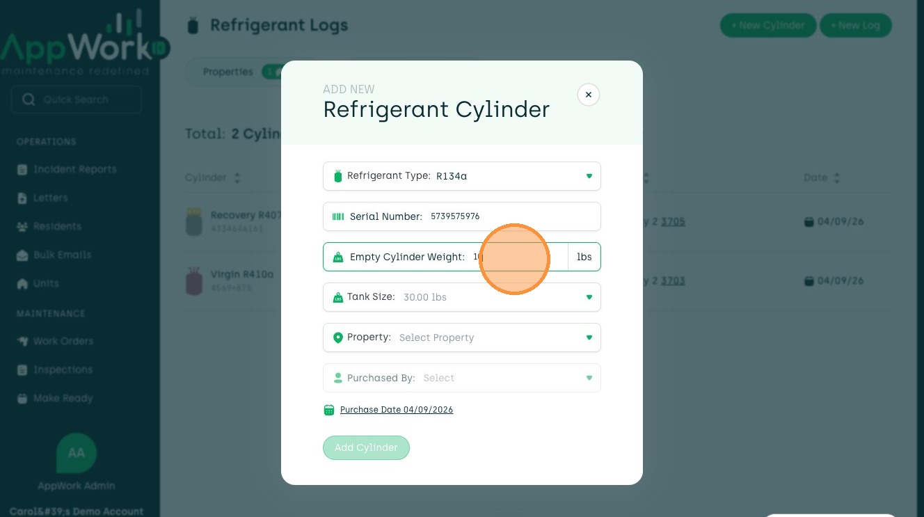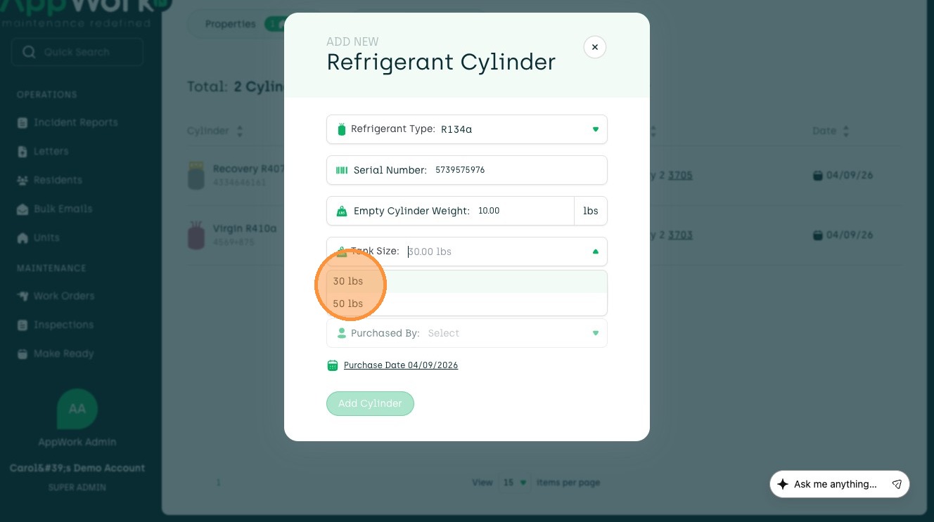 How to Add A Recovery Refrigerant Cylinder In AppWork
