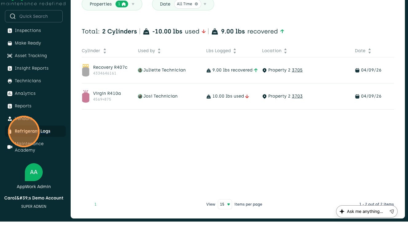 1. Navigate to Refrigerant Logs in the sidebar menu.