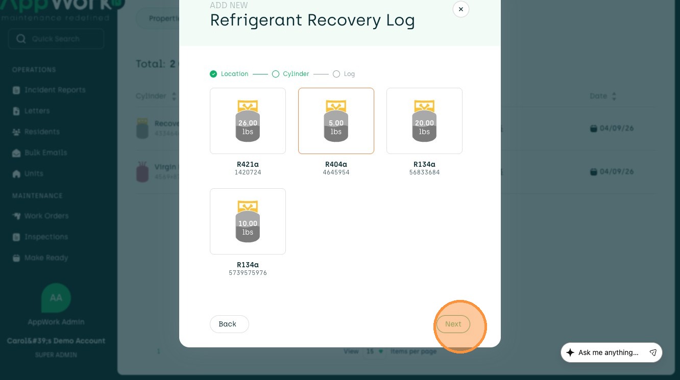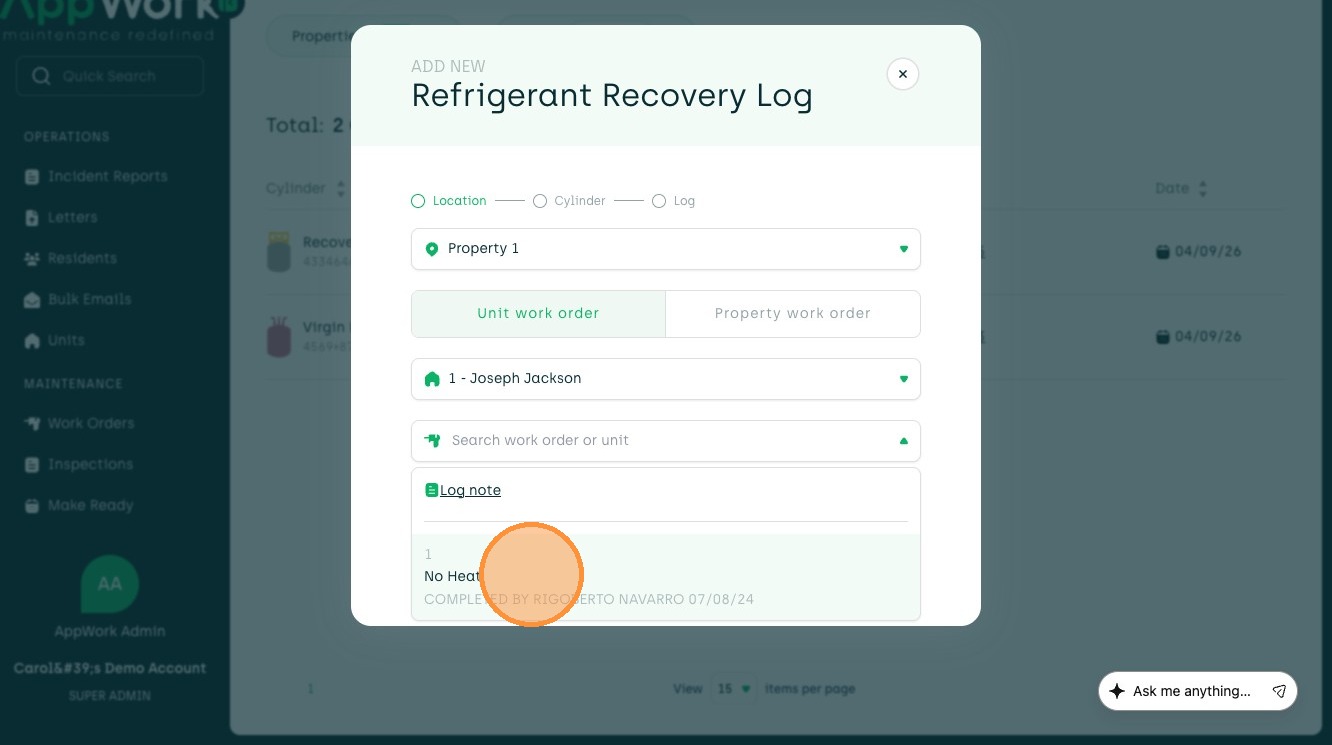 7. Pick which work order you will be using the refrigerant for.