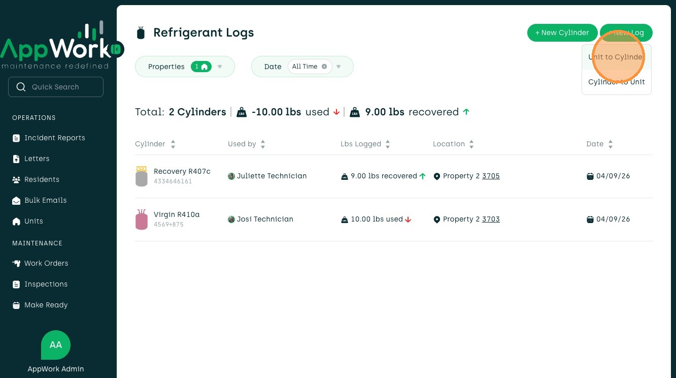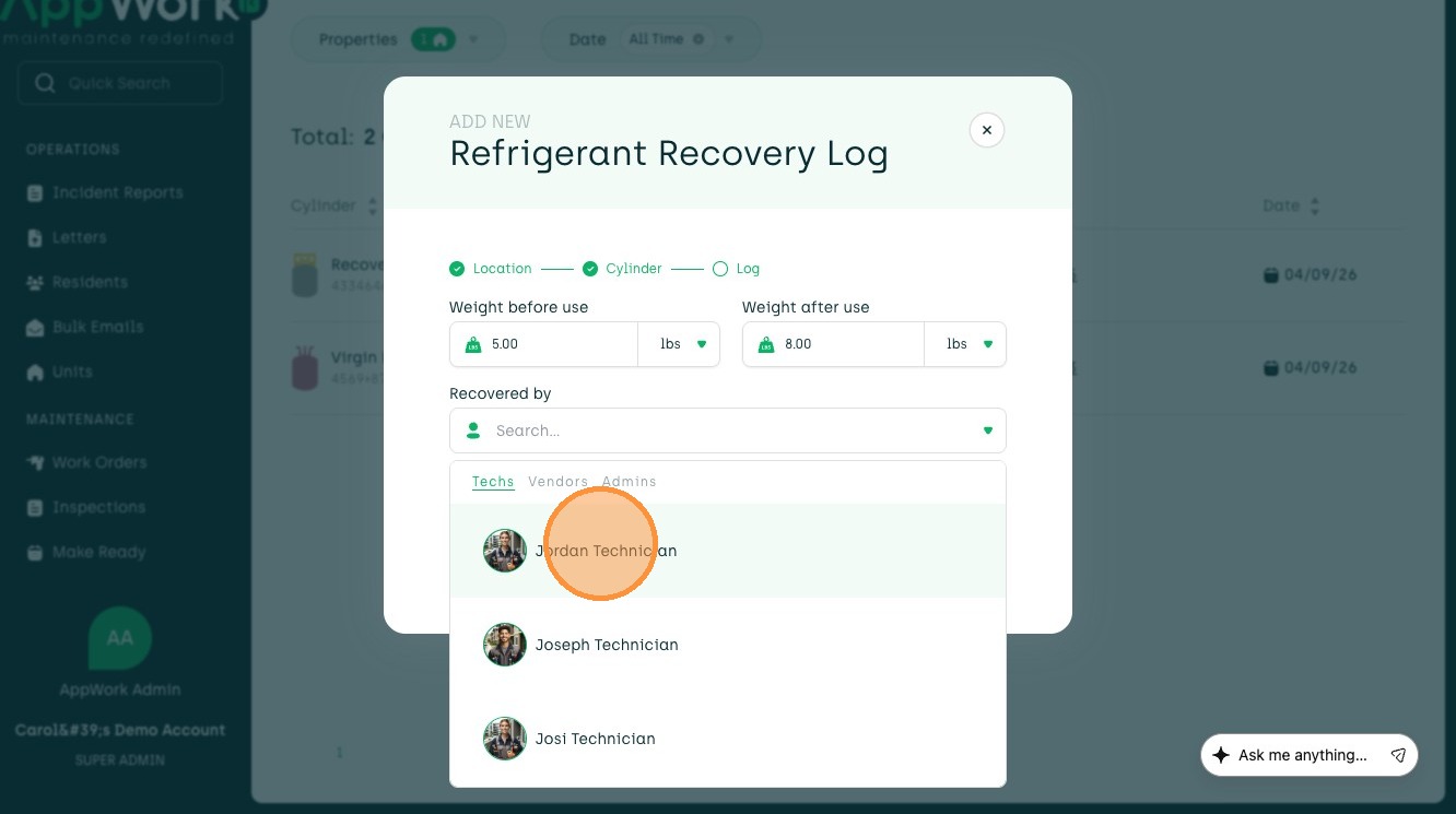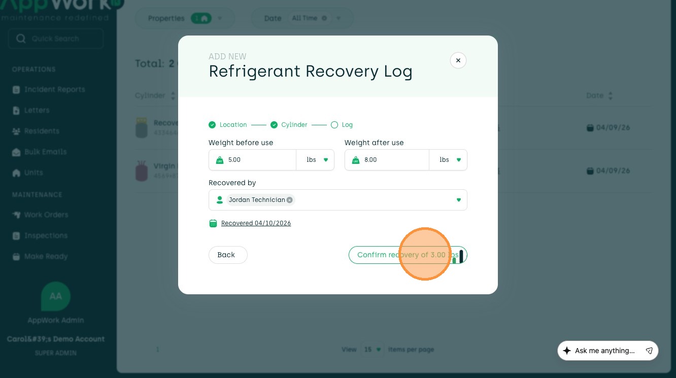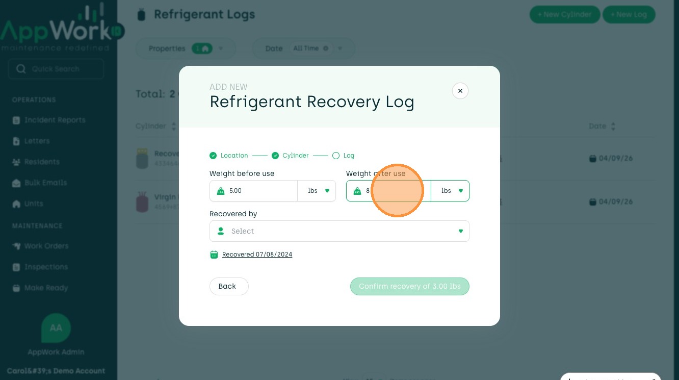 Follow this guide to accurately record refrigerant recovery data from a unit to a cylinder. This process ensures your maintenance logs are updated with correct technician details, weight amounts, and work order associations.