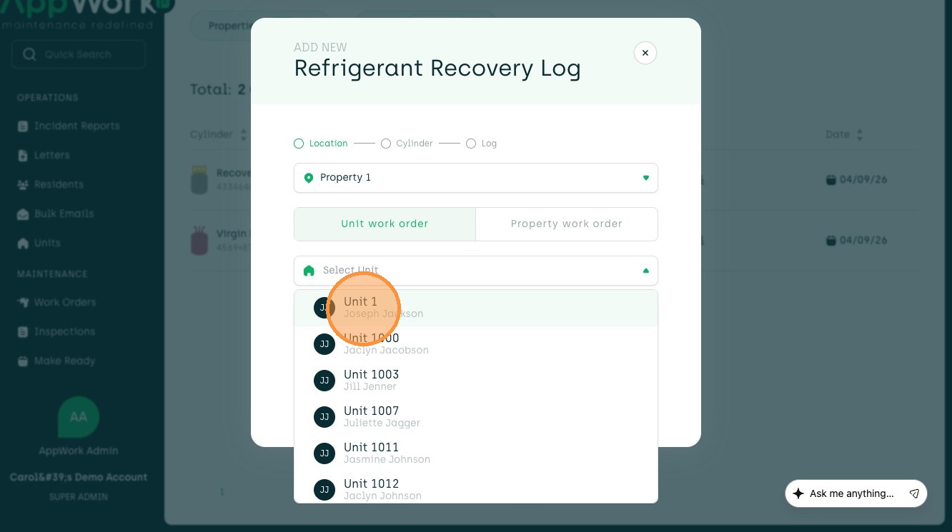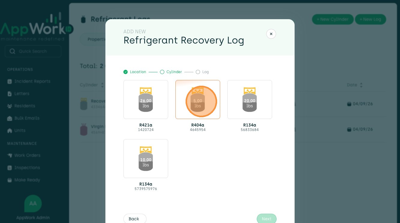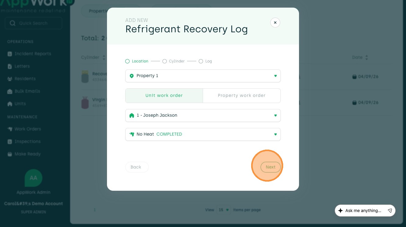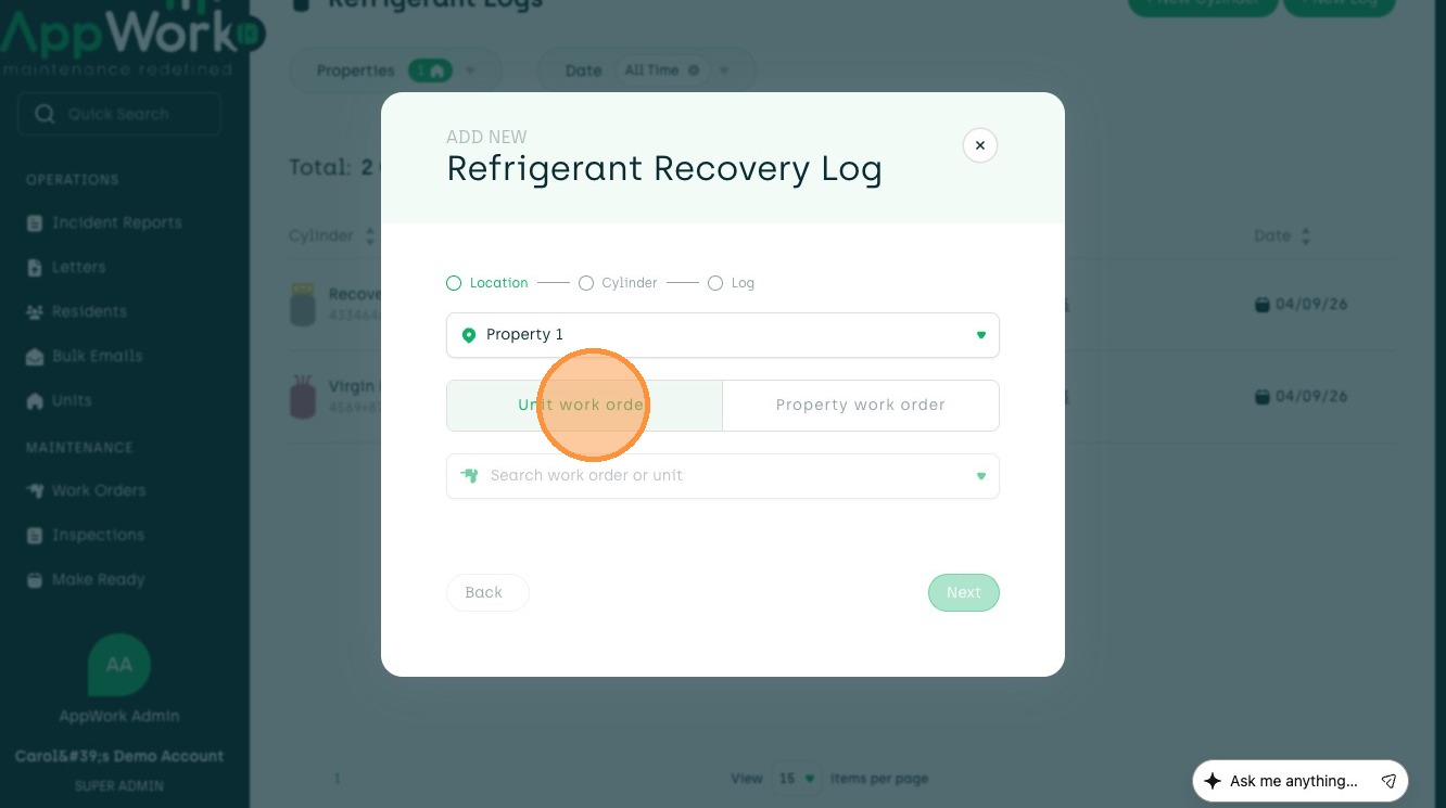 Follow this guide to accurately record refrigerant recovery data from a unit to a cylinder. This process ensures your maintenance logs are updated with correct technician details, weight amounts, and work order associations.