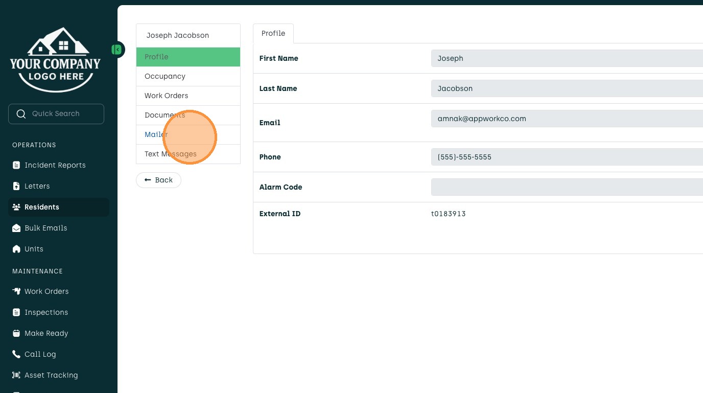 4. Once in the resident's profile, navigate to the "mailer" tab to view any email correspondence to and from them.