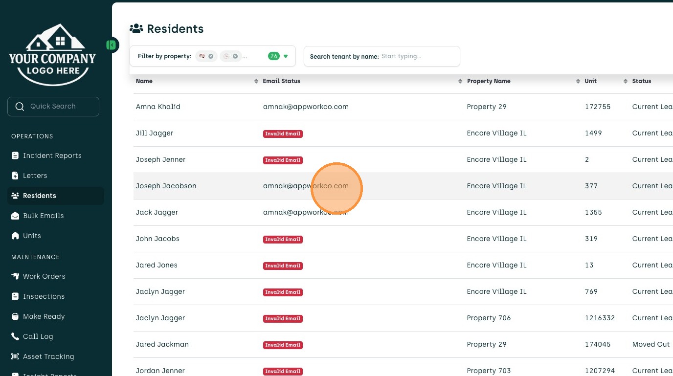 3. Find the resident you would like to view communications for. You can either search by name or scroll through the list to find their name.